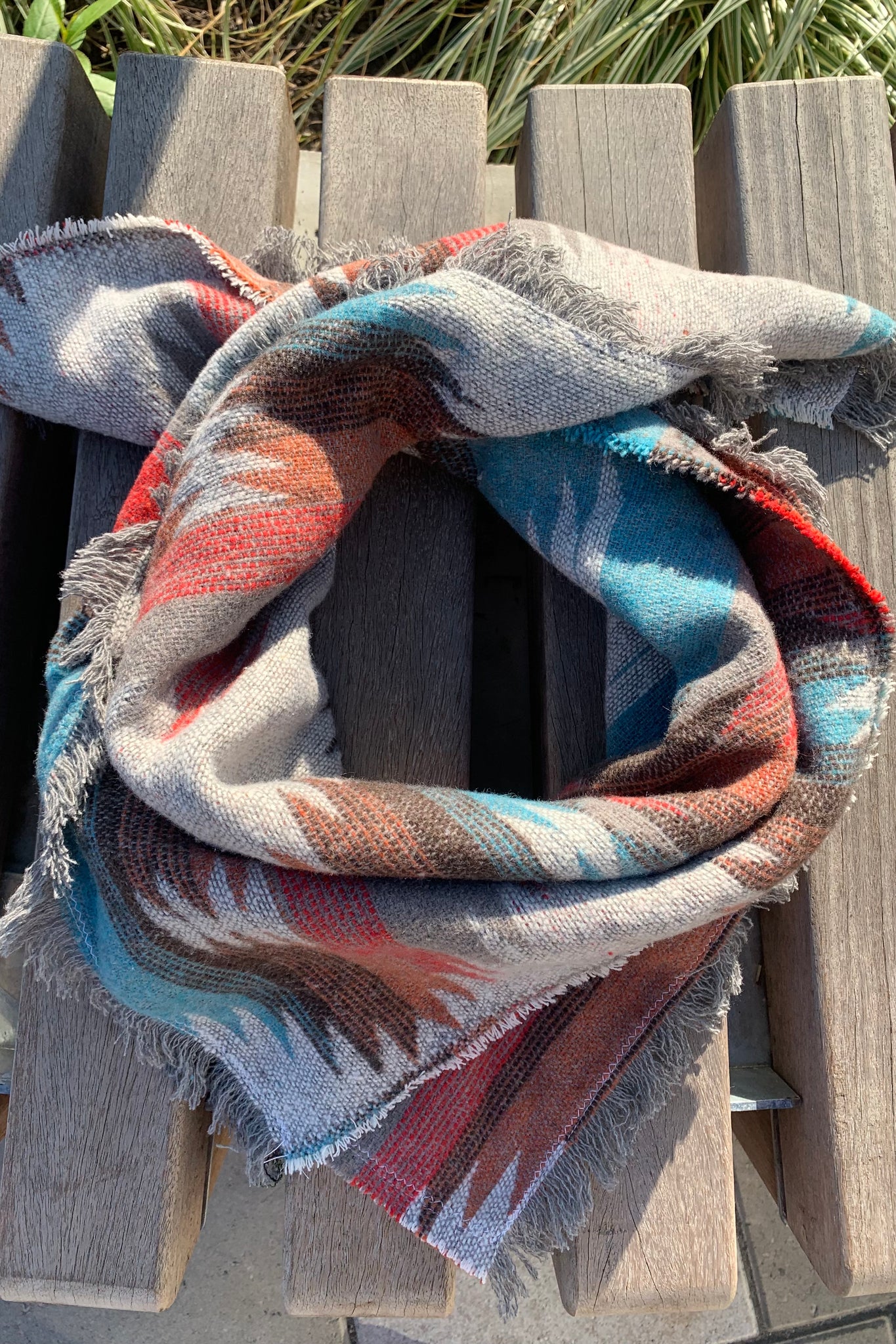 Approximately 30X30 inch square. Aztec print scarves are made locally in Maple Ridge BC.Ā 20% wool 80% Acrylic Machine wash in cold water hang to dry Ā